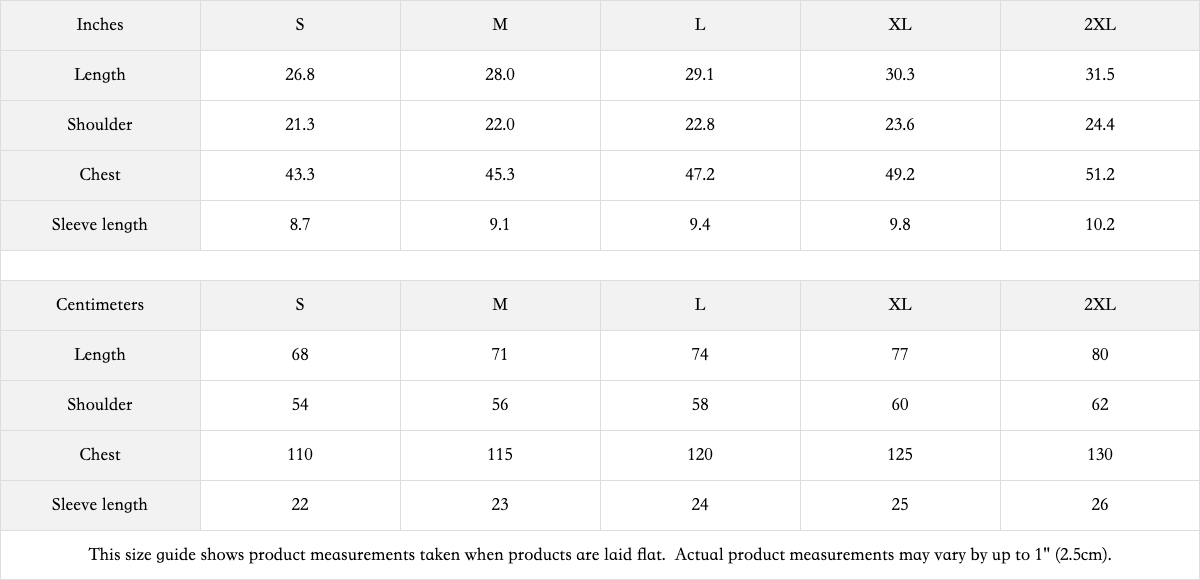 Tees Size Chart