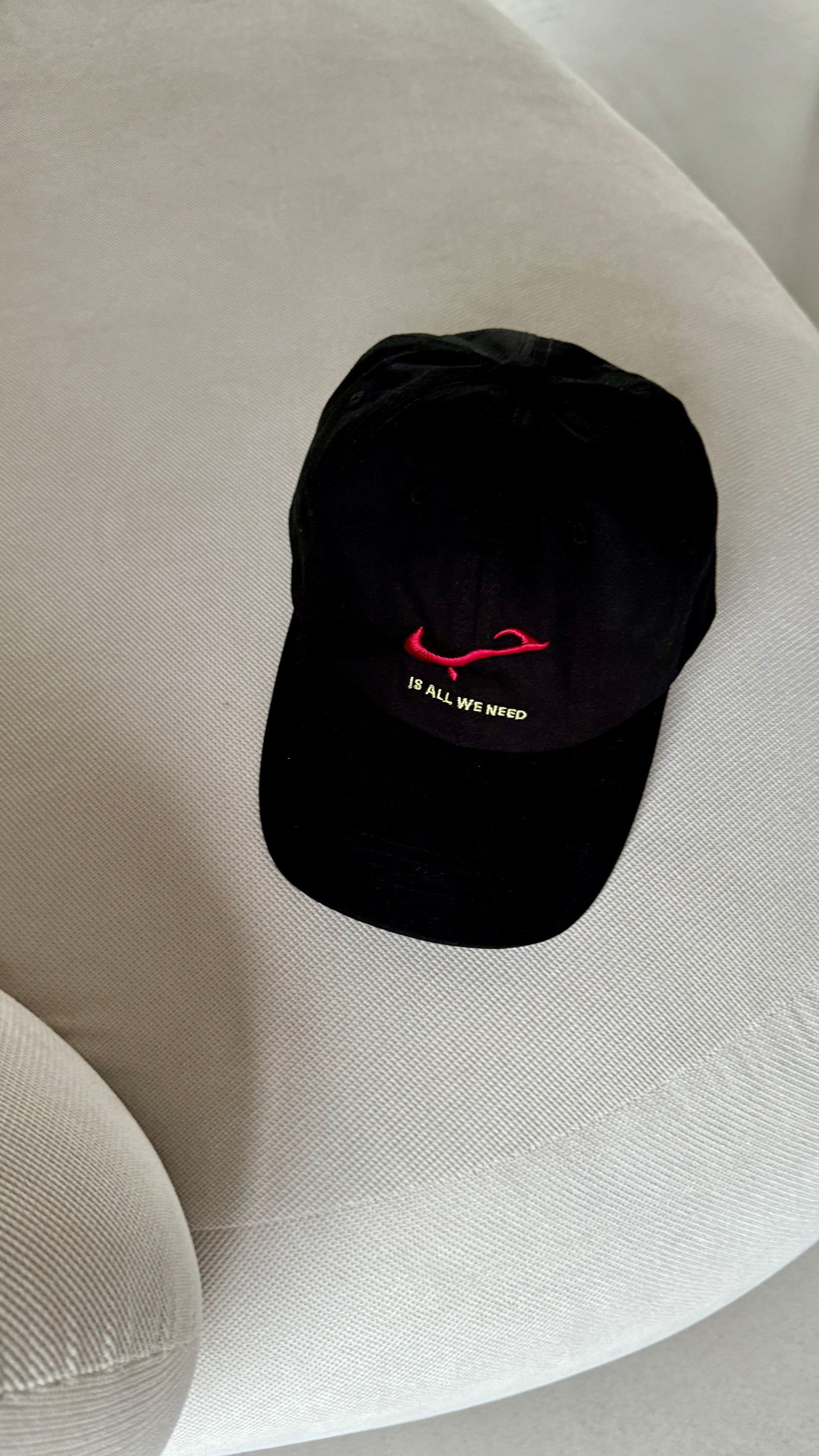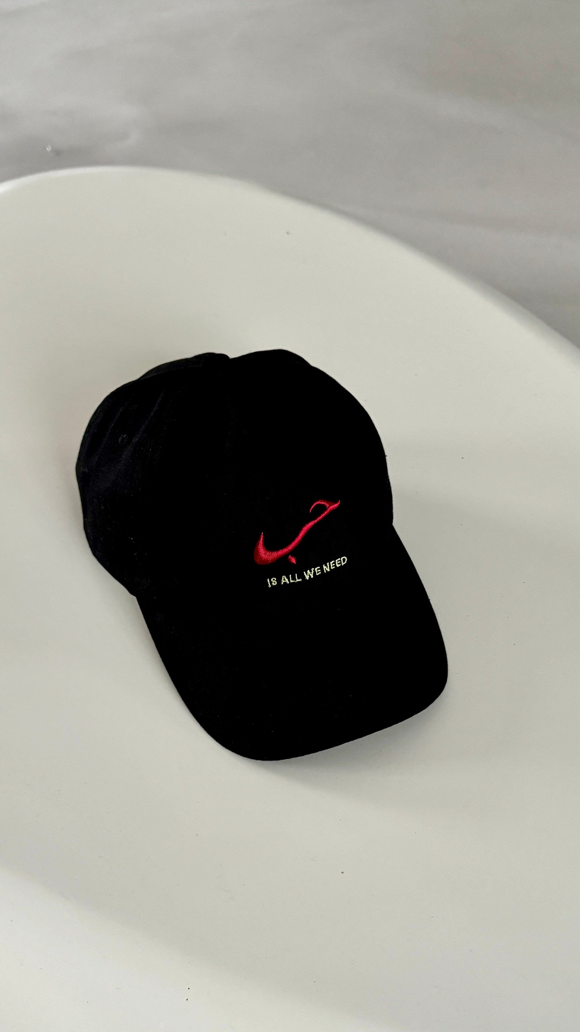 Mid Flat visor, panel unstructured black crown cotton cap. 'Hubb is all we need' on the front in red and light green and 'Inspired by cultures' on the back, both embroidered in light green.